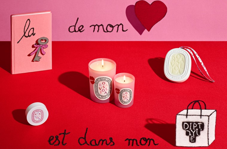“For Valentine’s Day, in collaboration with diptyque, Olympia Le-Tan has created a decor inspired by her universe featuring a unique pink fabric, characteristic of her creations. Her playful and colourful patterns adorn the sleeve and pouch of the limited edition Eau Rose collection.”