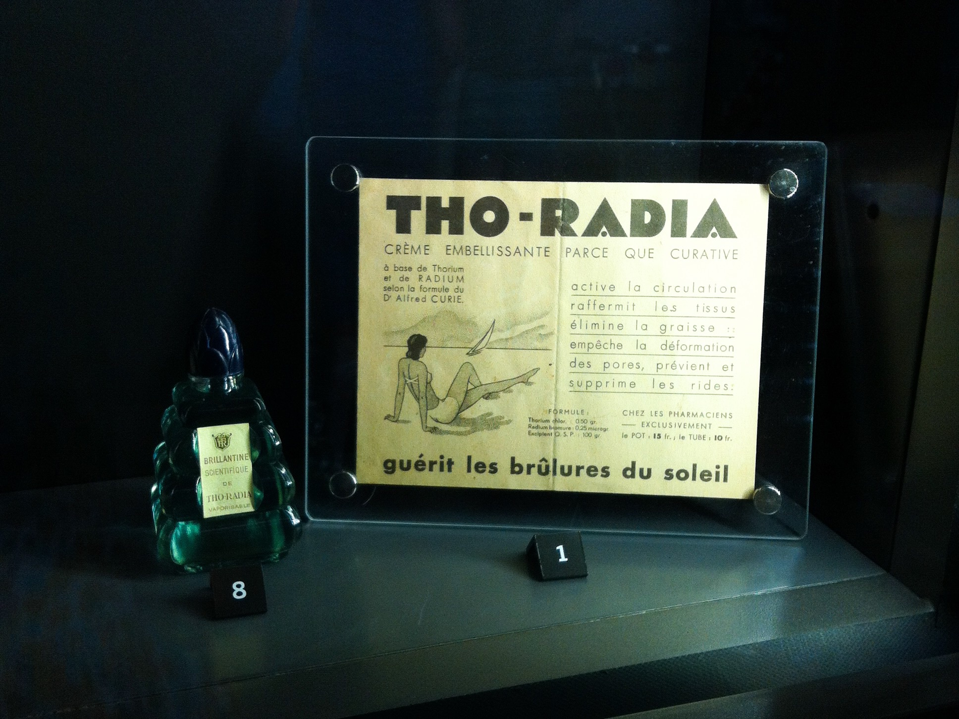 Самая запоминающаяся часть выставки связана со «Всеобщей Обсессией», вспыхнувшей сразу после открытия Радия в начале 20 века. Мистический элемент был моментально наделен целебными свойствами, и на рынке появились продукты питания (шоколад, хлеб, питьевая вода), косметика (крем для лица, зубная паста, пудра) и всевозможные витамины с добавлением Радия. Так, знаменитая косметическая марка Tho-Radia заявляла, что их крем создан «на основе Тория и Радия по уникальной формуле доктора Альфреда Кюри», на деле не связанного никаким родством с Мари и Пьером. Не беспокойтесь, поскольку Радий — это дорогостоящий и редкий элемент (Мари Кюри трудилась 12 лет, чтобы получить крошечную частицу), его содержание во всех «чудодейственных» продуктах было настолько ничтожным, что не могло причинить вреда. В 1937 году Радий был причислен к группе ядов. Обсессия прекратилась.